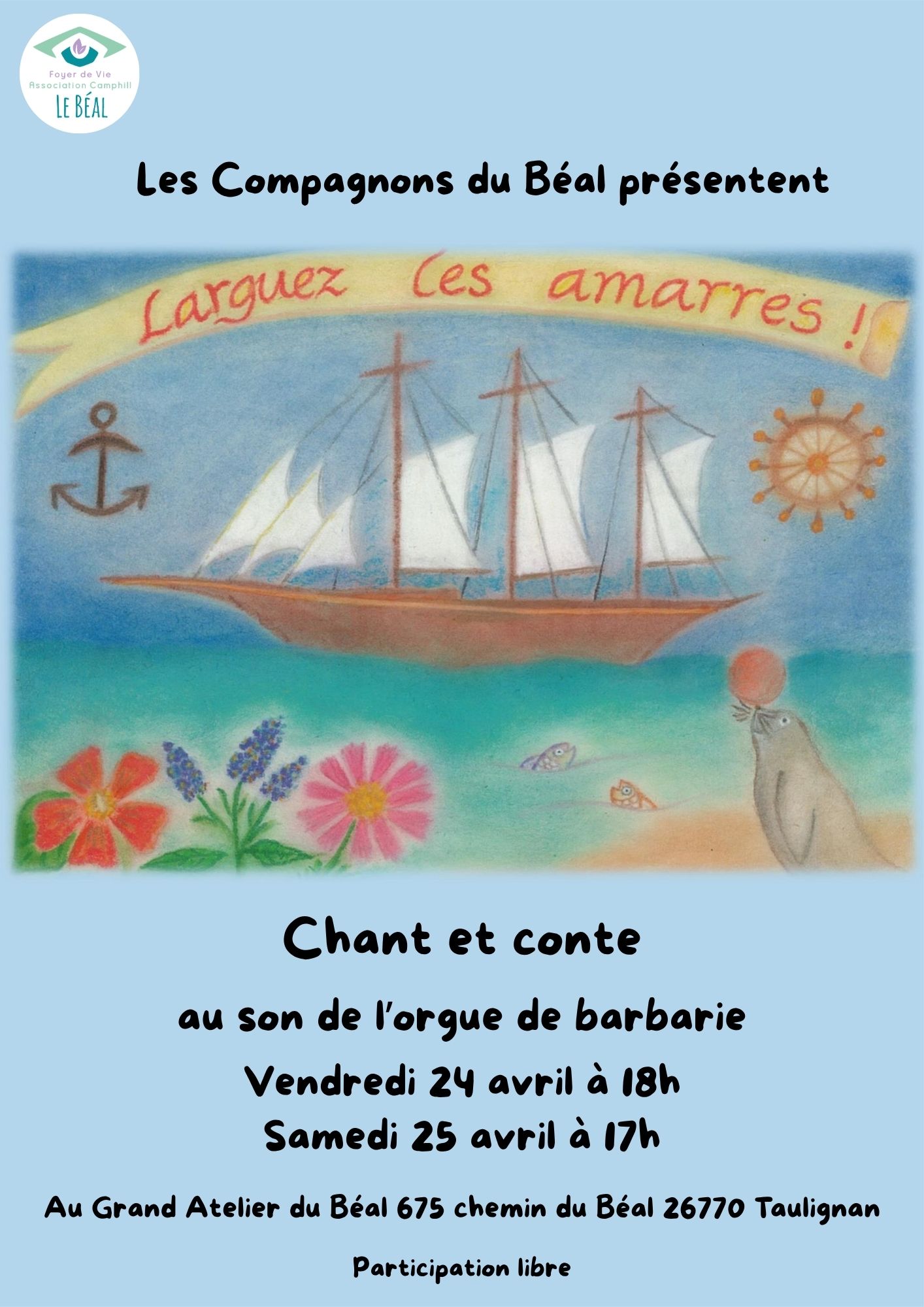 Nous somme heureux de vous présenter le spectacle « Larguez les amarres », une création de conte autour de chants connus accompagnés à l’orgue de Barbarie, avec les compagnons, les professionnels et les jeunes volontaires.